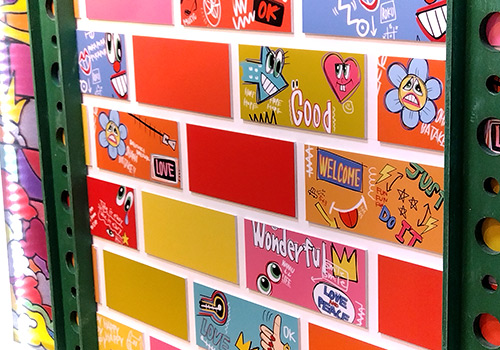 はい。スニーカーやTシャツ、スケボー、お花、お菓子など。演出サイドからの要望もありますが、あとは装飾スタッフとあれこれ話しながら集めました。番組としてのメインの色が15種類もあるので、同色のグラデーションというよりはそれぞれの色をどう配置するかを意識して飾っています。他にもロゴやキャラクターの着ているシャツなどに、青山さんならではの文字が入っているんです。昼四郎の胸に「ノーマヨ、ノーライフ」とか。そこに引っかけてマヨネーズに名前を書いてボトルキープにしてみたり。細かい遊びをいろんなところでやってます。