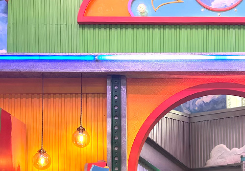 番組ロゴの吊り看板もカラフルに。ビミョーな凹凸が