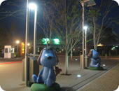 地球環境に配慮したこのスタジオのシンボルとして、「日本科学未来館」側に8基の「自然エネルギー利用の照明」を設置しています。風力と太陽光を利用して、夜間照明電力をしっかりと補うものです。皆さん、湾岸スタジオを訪れたら、是非この自然エネルギー照明にご注目ください。風車の部分が、元気よくくるくる回っているものや、ちょろっと回って止まってしまうものなど、個性豊か。風の流れの影響ですが、機械ではなく自然の力で動くということは、均一には機能しないということなのです。自然の力を目で確かめるチャンスですよ。