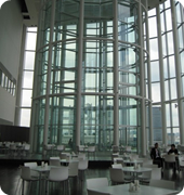 もう一つの、「AOMI」名物は、円筒形の吹き抜け(エア・チューブ)。エア・チューブの煙突効果で外気を取り入れ、自然換気による省エネを実現しました。スタジオで働くスタッフや出演者が使用するレストランでも、徹底的にエコを意識しているのが湾岸スタジオなのです。