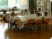 全校生徒数、わずか7人の山に囲まれた小学校。少人数のため、子どもたちは学年を問わず、大の仲良し。給食の時間も皆で一つのテーブルを囲み、まるで本物の家族のようです。