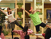 イベントの最後は、アトランタオリンピック体操日本代表の田中光先生が特別ゲストで登場。会場にいた子どもたちとパパやママ、ラフくん、大島アナウンサー、スタッフも一緒に、「どっこくん体操」に挑戦しました。オリジナル曲『ハロー!どっこくん。』のアップテンポに合わせて、腸の動きを刺激したり、バランスをとったり。