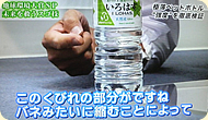 開発のポイントは、ペットボトルの薄さと強度の両立。薄くすれば、強さを犠牲にすることになる。そうなると、運搬の際にネックとなる・・・この課題をあえてペットボトルに溝を刻むことで、柔軟性を持たせて克服し、商品化にこぎつけたということです。