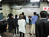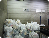 | 清掃スタッフが各職場の分別ごみ箱 から回収したゴミが、ストック ヤードに集まります。全体の流れに ついて説明を受ける代表委員たち |