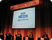 後半では、ソフィアバンクの藤沢久美副代表を進行役にパネルディスカッションが行われた。この中で、坂根正弘経団連副会長は「京都議定書は不公平。米国不参加と中国の削減義務無しやEUは27カ国で一つの目標はいかがなものか」と指摘。桝本晃章日本動力協会会長は「京都の次のステップを考えるべき。アジア地域での仲間作りが重要」と発言しました。逢見直人日本労働組合総連合会副事務局長は「日本の削減目標が突出することを懸念する。それは雇用の海外流出にもつながる」と主張しました。環境に関する専門家の山本隆三富士常葉大学教授は「京都議定書から12年以上を過ぎて、GDPが中国、ブラジルなど新興国で相当伸びている。アメリカ、EUの2大累積排出国にはもっと責任をもってもらう必要がある。京都議定書の単純延長はあり得ない」と主張するなど、およそ1時間15分のパネルディスカッションは熱い空気を残して幕を閉じました。