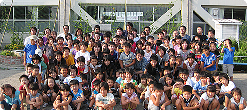 またアナウンサーの基本である正しい発声法を体験した子どもたちは、元気いっぱいに大きい声を出して楽しんでいました。最後はみんなで記念撮影。この日は、みんなで夕食のカレーを作り、体育館にお泊りするという楽しい企画が待っている子ども達は、興奮ぎみに写真に納まっていました。