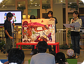 続いて春日アナがオリジナル大型紙芝居「ハロー!どっこくん-チョコリン大魔王が襲ってきた!の巻-」を朗読。子ども達は、どっこくんの大活躍と四季折々の食べ物の登場に興味深く聞き入っていました。