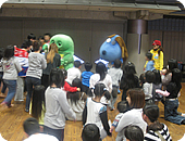 次に向かったのが、足立区にある東京武道館。ここは約300人の避難者がいて、会場となった武道館内の講堂には60人ほどの子どもたちが集まりました。震災後1週間以上も避難所暮らしとあって、子どもたちはガチャピンとラフくんと写真撮影をしたり握手をしたり、またかけっこをしたりと大はしゃぎの1時間ほどでした。