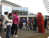 まず最初に訪れたのは調布市の味の素スタジアム。ここには主に福島第一原発事故の影響で避難している家族150人ほどが生活しています。この日集まった子どもたちはおよそ40人。琉球獅子舞の飛び入り参加もあり、子どもたちは大喜びでした。最後にラフくんカレンダーを子どもたち全員に手渡しして会場をあとにしました。