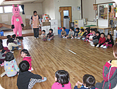 次に向かったのは、堤乳幼児保育園。この幼稚園は被災倒壊した別の幼稚園からの園児も受け入れており、現在40名程ですが今後増えるとのこと。ミット君が登場すると、きれいに円陣を組んで座っていた子どもたちも大喜び、おもちゃをもらいみんなで記念撮影し、ここを後にしました。