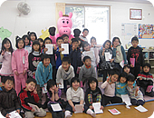 次に、赤浜小学校避難所を訪問。30名程の小学生に要望のあつたパズルやゲーム、文房具などを届け、大槌町最後の訪問地大槌北小学校へと向かいました。大槌北小は津波で1階が浸水、この日は大槌高校内の仮教室で始業式前の事前学習日、1年生から6年生まで100名ほどの児童が集まりました。本来はパソコン学習用の教室でのミット君との交流会でしたが、とても賑やかで元気な子どもたちの声が響いていました。
