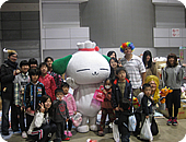 この日はおよそ50人の子どもたちがふくたんを迎えてくれました。ホールの隅に特設されたキッズコーナーで握手をしたり記念撮影をし、持ってきたおもちゃや文具をみんなに差し上げました。特に女の子たちにぬいぐるみは大人気。胸に抱えて嬉しそうな姿が微笑ましく感じられました。