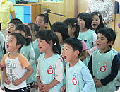 始まる前の音チェックだけで、園児たちが集まり、さっそく「まるまるもりもり~♪」