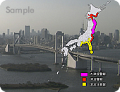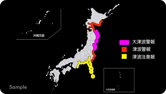 デザインは「色のバリアフリー」を目指すカラーユニバーサルデザイン機構(CUDO)が考案、大津波警報を太線の紫色、津波警報を赤色、津波注意報を黄色とし、国内に300万人以上いるとされる色弱者やお年寄りにも配慮したわかりやすいデザインになっています。