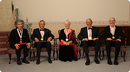 | (左から)音楽部門 小澤征爾 / 彫刻部門 アニッシュ・カプーア / 演劇映像部門 ジュディ・デンチ 建築部門 リカルド・レゴレッタ / 絵画部門 ビル・ヴィオラ |