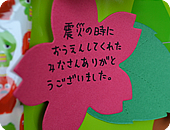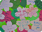 「震災の時におうえんしてくれたみなさんありがとうございました。」「お母さん、生んでくれてありがとう」など、2日間で約700の「ありがとうの花」が集まり、「木」は満開に・・・!