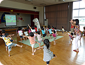 元気に体操する子どもたち紙芝居の後は、「ハロー!どっこくん体操」と「マル・マル・モリ・モリ」を楽しく一緒に踊りました♪♪