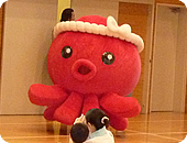 南三陸のキャラクター・オクトパスくん午後には入谷小学校の体育館では仙台放送のキャラクタージュニくんに続いて特別ゲストとして南三陸町のキャラクターオクトパスくんも登場。