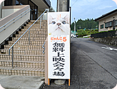 不安とワクワクが入り混じる心境のなか、会場である塙町公民館に向かいました。公民館に着いてまずびっくりしたのが、『にゃんこ THE MOVIE5』の立て看板に、ずらっと並べられたポスター!塙町の職員さんのご厚意に、私も緊張している場合ではない!頑張ろう!というパワーをいただきました。