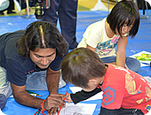 また、インド絵画を紹介し、インドのアーティストと一緒に絵を描くワークショップも実施。言葉は通じなくても子どもたちと一緒に楽しそうに絵を描いていました。