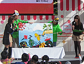 秋晴れの日曜日、沢山のお客さんが集まったエンゼル広場のエンゼルステージで2回の「ハロー!どっこくん」の食育出前授業を行いました。