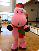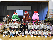 ガチャピンとムックからクリスマスプレゼントを渡し、その後クラスごとに記念撮影しました。どの子もみんな興味津々でガチャピンとムック、そしてミット君に近寄ってきます。抱きついたり、握手をしたり、思い思いの愛情表現を見せてくれました。中には大きさに驚いたのか泣いている子もいましたが、先生も含めてみんなが喜んでくれたので、とてもうれしかったです。