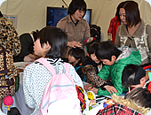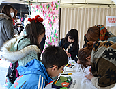 開会前からブースの前で足を停めるお客さまがかなりいました。狭いブースの中で、桜の花の形や葉っぱの形のメッセージカードに「夢」を書く人たちがひしめきあいます。