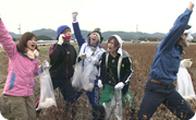 2011年は、福島県新地町の目黒文夫さんの田んぼで綿花を栽培し、35キロの綿花を収穫することができました。予定の10分の1の収穫量でしたが、小さな一歩は「この土地でまた作物が作れる」という大きな希望となりました。