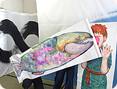 母と息子でとある湖に小舟で出かけ、子どもが魚を探そうと湖面に顔を近づけた瞬間、「がぶっ」と鼻を鱒にかまれてしまい、痛いのとびっくりした拍子にそのまま体を元に戻すと、鱒が船に入り込み、見事鼻で鱒をつったというお話。(本当にあったお話だそうですよ。)