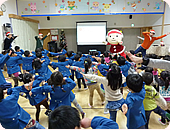 どっこくんのお話、どっこくん体操とみんな真剣に元気よくダンス!