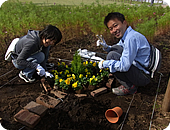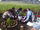 テーマは「出会いの小径」他のグループの進み具合が気になりながらも、いつしか自分たちの花壇づくりの作業に没頭し、どのグループも2時間かからずに、見事完成となりました。