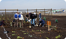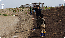 ボランティアスタッフの皆さん 今は、まだまだ緑が少なく、ほとんどが土に覆われた埋立て地でしたが、一緒に植えた小さな木々が、将来森になり、その森を息子と一緒に楽しめたら最高です。