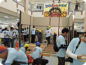 そんな思いで始まったプロジェクト。今回は和室のセットとサザエさんなどのキャラクターの衣装、そして、セットの廃材を利用して作った輪ゴム鉄砲の工作キットを持って、大船渡市にあるショッピングセンターのイベント会場に「こども笑顔ひろば」を作りました。