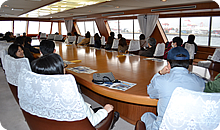 3月13日あいにくの雨模様でしたが、この日のために予約していた東京都所有の視察船『新東京丸』に36名のメンバーで乗り込み、我々の生活に深く関わる東京港の役割を勉強