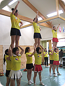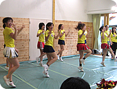 次に、チアの中でも一緒に声で応援をする「コール」というものに合わせて「レッツゴーアルバ!」とみんなで大きな声を出しました。おなかから声を出すと、元気になります!