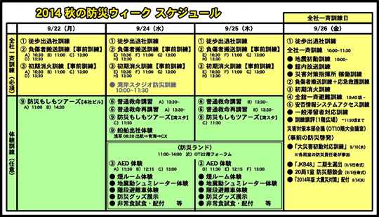 今年も9月22日(月)から26日(金)(※23日は祝日)の4日間、『実践』をテーマに、これまでにない『初動3時間』を意識した訓練と昨年に引き続きフジテレビ流『自助・共助・公助』を社内に浸透させる取り組みを芝消防署の協力のもと開催しました。