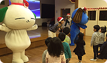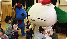 広野町保育所の子どもたちも合流して、いよいよクリスマス会!ラフ君と福島テレビの福袋キャラのふくたんという“ビッグなおともだち"登場に子どもたちの目がキラキラ。いや、一部の子どもたちの目はギラギラ。