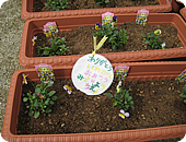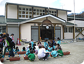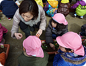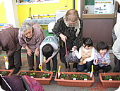 仮設住宅の皆さんと 当日、30名の園児たちに仮設住宅のお年寄り15人ほどが加わり、仲良く植替えをしました。先生も慣れたもので、「おじいちゃん、おばあちゃんは腰が痛くてしゃがめないから、シャベルで掘るのは子どもたちがやってね」と、さりげなく役割分担を指示。手際良く植替えが終わると、お年寄りたちは「じゃあ、またね」と、手を振りながら隣の住宅に帰って行きました。