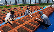 5月30日、湾岸スタジオ屋上で、そのスタートとなる「ひまわりの種まき」が行われ、報道スタッフのほかアナウンサー、CSR推進プロジェクトチームメンバーも参加してプランターに約1000粒の種をまきました!炎天下での作業となりましたが、元気な花を咲かせてほしいと1粒1粒丁寧に土の中へ…屋外で汗をかきながらの作業で気持ちもリフレッシュできました。