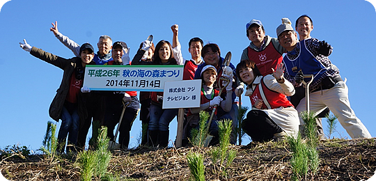 東京都港湾局が中心になり、市民や団体、企業やNPOなど色々な活動主体が協力して 進められており、私たちフジテレビは、この『海の森』プロジェクトの趣旨に賛同し、苗木を植える活動に、2011年、2013年、2014年3月とこれまでに3回参加しています。