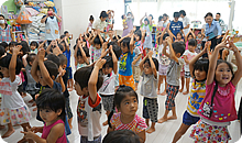 紙芝居の後は、沖縄テレビのキャラクター「ゆーたん」も登場。みんなで一緒に「どっこくん体操」、そして「ちびまる子ちゃん」でおなじみの「ピーヒャラダンス」を元気よく踊りました。