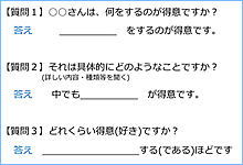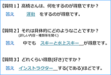 まず片方が「聞き役」に、もう片方が「話す役」になり、インタビューを行い、「聞き役」は聞いたことを用紙に書き込みます。全部聞き終わったら役割を交代して同じことをします。メモの部分をつなげれば「リポート」原稿が完成!どうです? これに沿って進めれば、インタビューとリポートが誰でも簡単にできてしまうのです!そして、ここが大事! 「インタビュー」を、より上手くやるコツなのですが…