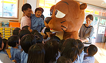 紙芝居の後は、高知さんさんテレビの「さんのすけ」も加わり、みんなで「どっこくん体操」、「ピーヒャラダンス」を一緒にノリノリで踊りました。大村アナウンサーが「めざましテレビ」を担当していることから、試しに子どもたちと「めざましじゃんけん」をしてみたらこれも大盛り上がりでした。