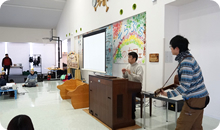 握手をしたり、抱っこをしたりした後、食育出前授業「どっこくん」の紙芝居を楽しんでもらいました。