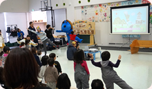 誰が何をやる、という役割分担が具体的にあるわけではなく、大勢の大人たちが子どもを近くでそっと見守っているだけ。子どもたちと一緒に紙芝居を楽しむ、歌を歌う、「どっこくん体操」をする・・・ギターを演奏する・・・