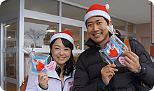 参加した酒主義久アナウンサーは自前のサンタ衣装を東京から持参で気合い十分。もう一人のキュートなサンタさんは岩手めんこいテレビの米澤かおりアナウンサー。