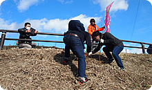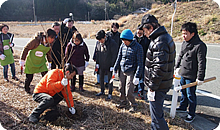 太平洋を一望する小山の上で、晴れ渡る空の下、みんなが1本1本丁寧に桜の苗を植えました。
