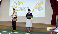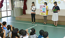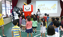 消化の仕組み~「どっこくんの紙芝居」で頭を使った後は、アナウンサーから発声指導、お馴染みのどっこくん体操。さらに、ちびまる子ちゃんの「ピーヒャラダンス」で体を思い切り動かしてもらいました。
