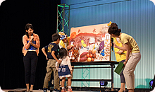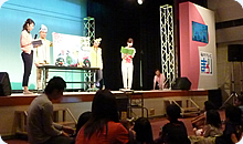 客席にいた子どもたちが、ぞろぞろとステージ前に集まり、紙芝居に耳を傾け、野菜の名前を当てるクイズにも元気よく参加してくれました。