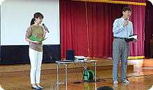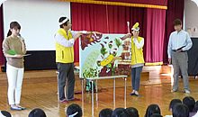 冗談はさておき、3年ぶり2度目の開催の町立関ヶ原小学校附属幼稚園では、30名ほどの園児に、給食試食会に参加していた保護者の皆さんを加えた60名近い方々を相手に、ベテラン庄野アナとフジテレビ新人の宮司アナの“親子コンビ”でにぎやかに授業が始まりました。
